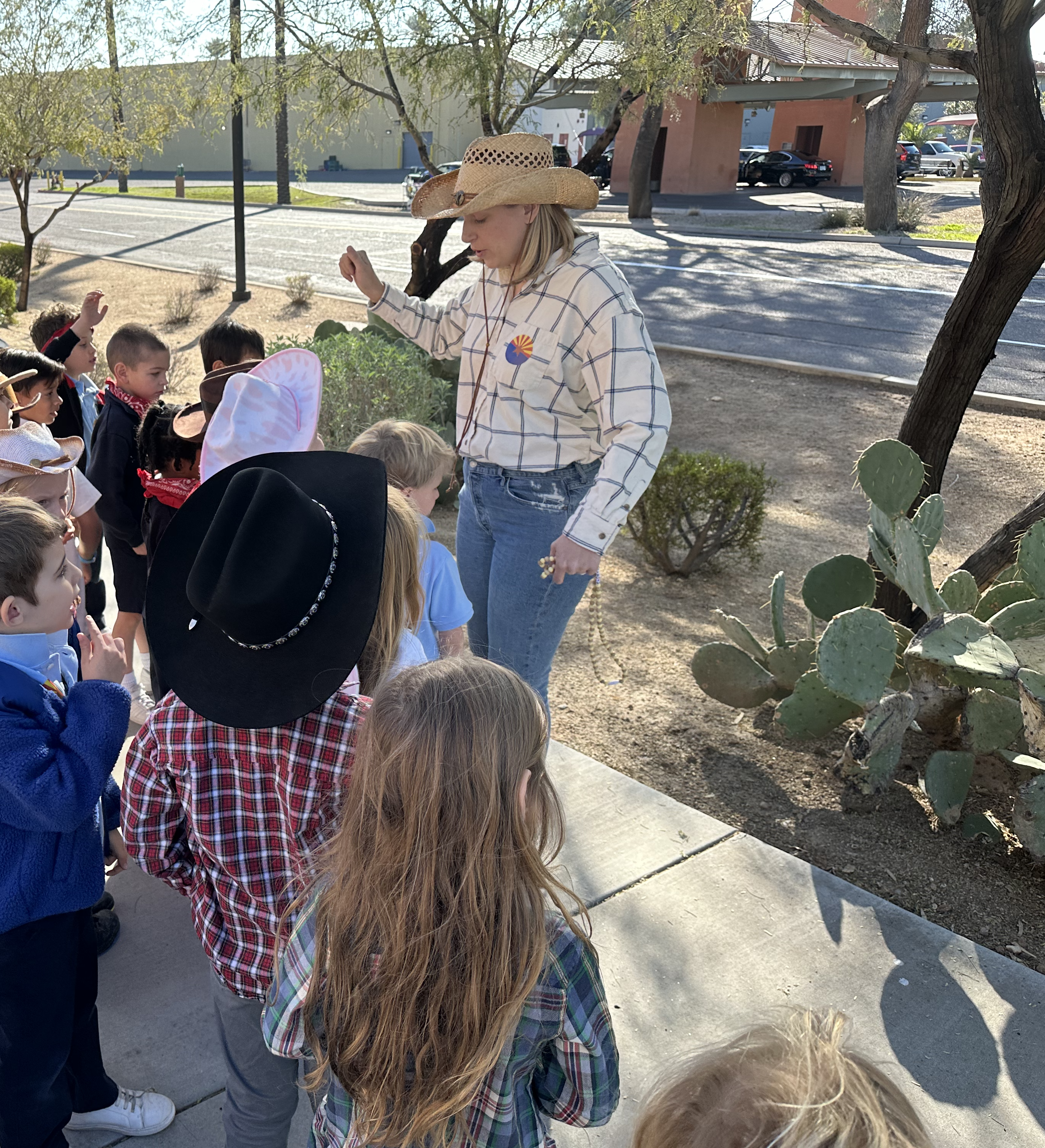 Archway Cicero Celebrates Arizona’s Birthday from A to Z Facebook Twitter Email This Post Archway Cicero February 14, 2024 While many celebrate love and relationships on February 14th, the kindergarten classes at Archway Cicero are giving love to Arizona in celebration of its 112th birthday. In true pioneer fashion, the kindergarteners dressed up in their finest southwest cowboy and cowgirl gear as they participated in some interactive and engaging activities while learning more about the 48th state in the union. Arizona became a state on this day, February 14th, 1912. Kindergarten lead teacher, Mikenna Strom, explained that while her class learned about their home state earlier in the school year as part of the kindergarten curriculum, it is fun to revisit and review some of the things they have learned as part of a full birthday celebration. “They love talking about the different places they have visited around our state like Flagstaff and the Grand Canyon.” “Everyone is so excited to wear their cowboy hats and boots,” said Strom. “And we have some exciting things planned for them today.” Those plans included reading books about Arizona during their reading time like G is for Grand Canyon: An Arizona Alphabet and Desert Digits: An Arizona Numbers Book. After reading time and some desert-themed coloring pages, the students were treated to a small nature hike to view the many native cactus and xeromorphic plants found around the campus. This was an exciting time for the students as they pointed out different varieties of cacti as well as some of the native birds the students have been studying. The air was a little crisp, but the sun was out, and skies were blue, providing the perfect Arizonian backdrop for the little exploring pioneers. Dean of Students, Kelsey Diamond, adorned in cowboy boots herself, explained that the students had also learned about the 5 C’s of Arizona, “Which are Copper, Cotton, Citrus, Cattle, and Climate,” she said. You may not be familiar with the 5 C’s of Arizona unless you have lived here a while, but these young scholars learned about each component. Strangely enough, and much to many Arizonians’ surprise, neither cactus nor coyote is included in Arizona’s 5 C’s. “This is our first year celebrating like this and I think it’s a great way to celebrate with our students and bring our community closer together as we learn more about the state that we live in,” said Diamond. The classrooms were bustling with special activities all morning. The celebration even caught the attention of local television news media, AZ Family whose interests were sparked by young students who were learning and celebrating the history of the Copper State. And what birthday celebration would be complete without a birthday cake? The eager students happily sang “Happy Birthday” to our great state before the beautifully decorated birthday cake, complete with our state flag, an orange-hued sunset and some flowering cactus, with the words, “Happy Birthday Arizona” spelled out in green frosting. Pieces of cake were passed out as faculty braced themselves for the anticipated sugar rush that would likely manifest in the afternoon. Happy 112th Birthday to you, Arizona! Do you have a story or know of a story that you would like to see featured at Great Hearts? Please contact jmoore@greatheartsamerica.org.