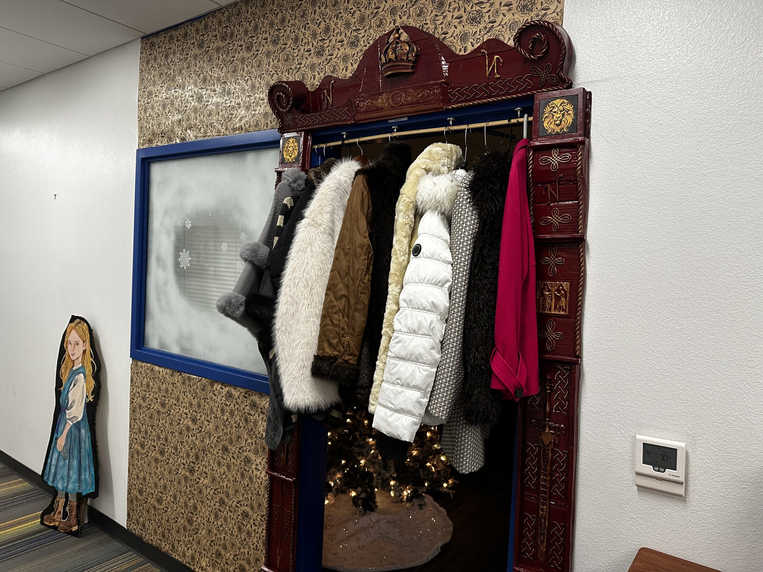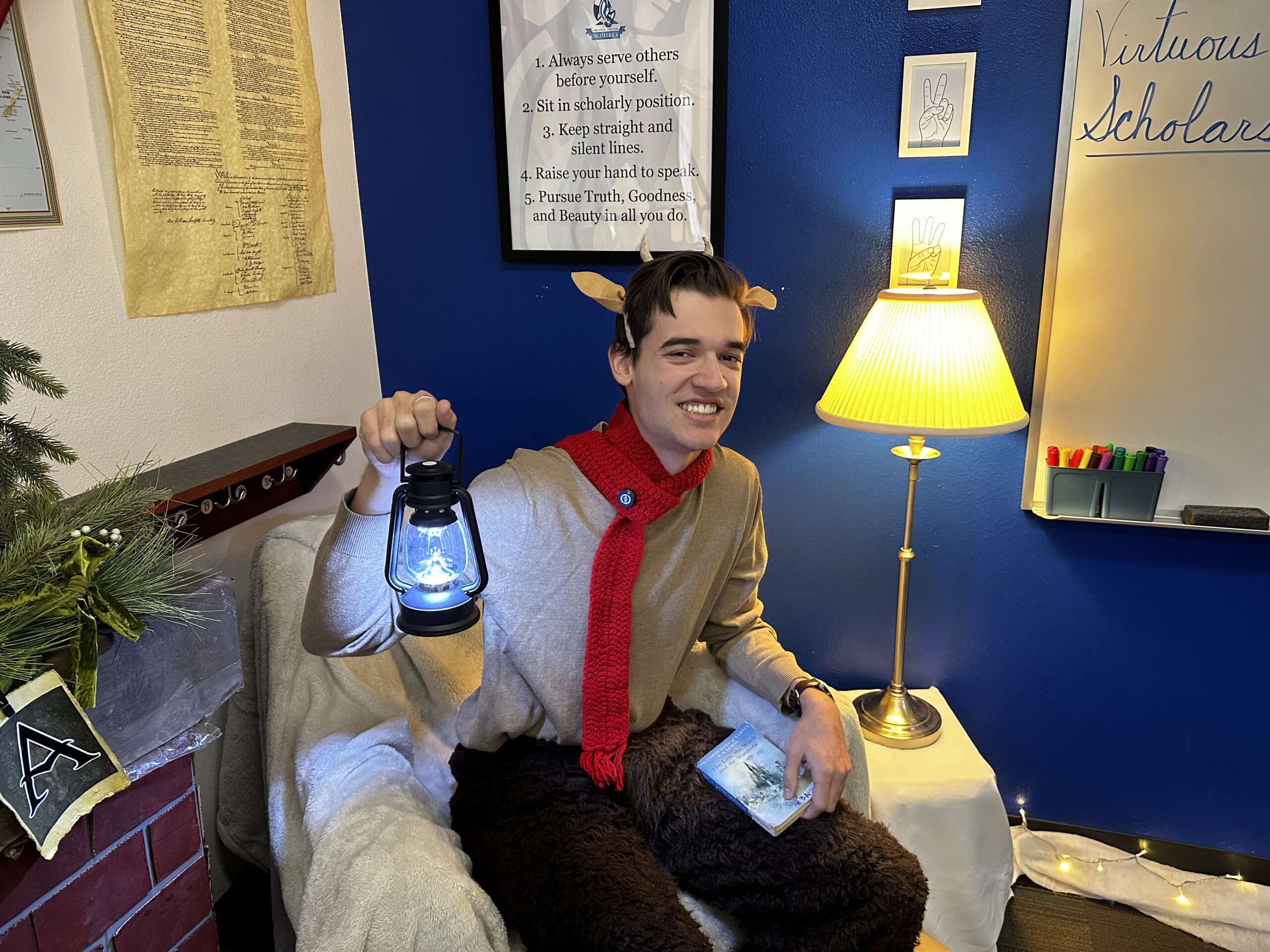 Archway Trivium Travels Though the Wardrobe to Narnia Facebook Twitter Email This Post Archway Trivium December 22, 2025 When the third graders at Archway Trivium complete their curricular read of The Lion, The Witch, and the Wardrobe by C.S. Lewis, they celebrate with a special visit from Mr. Tumnus and a host of magical characters from the book in an immersive experience they will remember throughout their days at Great Hearts. “Tea with Tumnus is one of the most beloved events at our school,” explained third-grade Assistant Teacher Lisa Regan, dressed as the Mother Christmas character from the book. “Even the seniors look back and they remember it as their very favorite experience at Archway Trivium and Trivium Prep.” The classic is the first of seven in The Chronicles of Narnia series. The books are set in the fictional land of Narnia, a land of talking animals and mythical creatures that is visited by English children through a magic wardrobe they find in a spare room. The doorways into the classrooms are made to look like the titular wardrobe complete with “hand-carved’ trim and hanging coats that students must brush through to enter a snowy scene, complete with the iconic lamppost from the story. It’s from the scene described in the book that Lucy, the first child to enter Narnia, sees upon her entry into the snowy woods. “It will not go out of my mind that if we pass this post and lantern, either we shall find strange adventures or else some great changes of our fortunes.” ―Lucy Pevensie from The Lion, the Witch and the Wardrobe. Thanks to the hard work and imagination of the third-grade teaching team and parent volunteers, it truly feels like students are transported into the land of Narnia. The transformation happens literally overnight. “The teachers were here quite late into the night and arrived very early this morning as well to prepare our hallway to turn into Narnia,” admitted Regan. The lights of the classrooms were dimmed to let the glow of twinkle lights highlight the fake snow and pine trees throughout each classroom. The desks were pushed together to form long tables carefully covered with white tablecloths and formally set with English teacups. While most third graders are not avid tea enthusiasts, the cups are filled with hot cocoa. Tumnus is a favorite character for many of the students. He is a faun in the book, which is a half human, half-goat creature that appears in Greek and Roman mythology. C.S. Lewis once wrote that the image of a faun carrying an umbrella and parcels through the snowy wood became the initial inspiration for the entire Narnia series. While the part of Mr. Tumnus is played by a different faculty member each year, it was Grant Stambaugh, a fourth-grade teacher at the school who filled his shoes, or hooves, this time, complete with the signature red scarf. Mr. Tumnus visits each classroom with furry pants to mimic the lower half of a goat, goat horns and floppy ears on his head, with packages and a lantern in hand as he enters. During his brief visit, students have the opportunity to ask their burning questions from the book. These carefully curated inquiries really display the students’ deep understanding of the story’s plots and themes, giving Mr. Tumnus the important job of giving thoughtful answers consistent with the story. While the event has grown more elaborate over the years, Tea with Tumnus remains a beloved tradition at Archway Trivium. It is a celebration that brings literature to life for third graders and creates memories that students carry with them long after they leave the snowy woods of Narnia behind. Do you have a story or know of one that you would like to see featured at Great Hearts? Please contact jmoore@greatheartsamerica.org. Submit a student application to a Great Hearts Academy by visiting: https://www.greatheartsamerica.org/enroll/. Great Hearts, Great Stories Monthly Roundup Receive monthly news and updates by subscribing to our newsletter. Name(Required) First Last Email(Required) Enter Email Confirm Email PhoneThis field is for validation purposes and should be left unchanged.