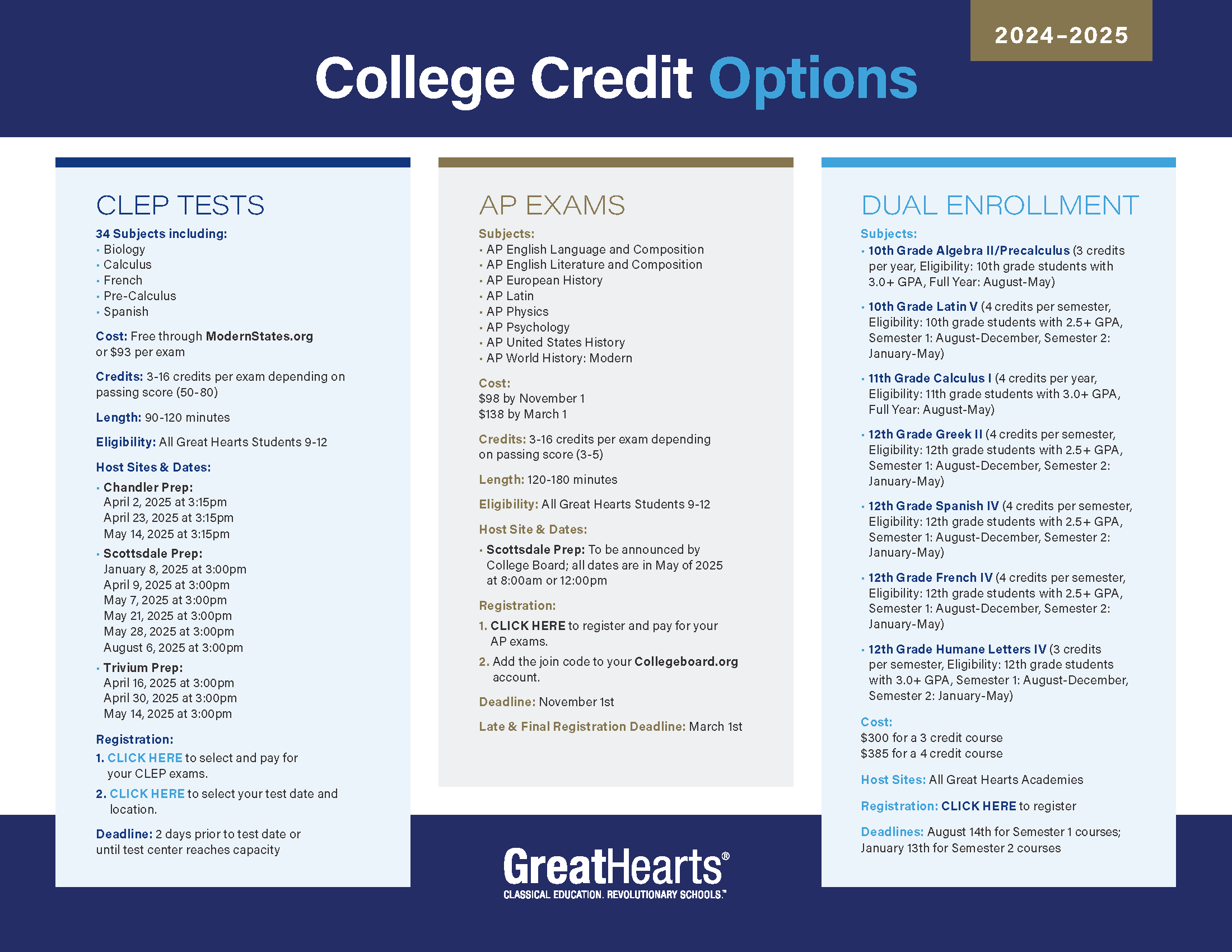 Great Hearts Arizona Responds to Feedback with New College Credit Options Facebook Twitter Email This Post Great Hearts Academies August 2, 2024 Great Hearts is pleased to announce three pathways for scholars to earn college credit while attending a Great Hearts Arizona academy through Dual Enrollment, Advanced Placement, and CLEP Testing. This initiative is in response to feedback from middle and high school students and parents we surveyed last year. Great Hearts leadership listened to the feedback, diligently worked with stakeholders and partners for a thoughtful solution, and is now ready to educate families on how to utilize the implemented improvements and resources. Mac Esau, Executive Director of Upper Schools in Arizona, along with Roslyn Fletcher, Director of College Counseling in Arizona, and Michael Austin, the National Director of Curriculum, recently hosted a virtual information session to present the pathways and answer questions about the new initiative. You can view the recorded session in its entirety below: “Something that we are becoming much more intentional about in the last couple of years is the evaluation and refinement of our high school program,” explained Esau. “First and foremost, we want to make sure that we are doing the work we profess to be doing to the best of our ability, and that is to cultivate the hearts and minds of all of our students in the pursuit of the True, the Good, and the Beautiful. Secondly, we want to make sure that as many students as possible are able to remain with us through the full training and graduate as seniors from all of our schools.” Esau explained that the primary barrier to providing college credit opportunities in the past had to do with the unwavering commitment to the current curriculum that is unique to Great Hearts. Parents have expressed that they don’t want to see this changed either. The challenge, according to Esau, was to find avenues to give families the benefit of earning college credits along the way without compromising the core purpose of cultivation and pursuit. Fletcher presented and explained in detail the three options now available for college credit: CLEP (College-Level Examination Program) Tests are available for all Great Hearts students in grades 9-12 at a cost and offered in 34 subjects. Pre-scheduled tests will be offered at Chandler Prep, Scottsdale Prep, and Trivium Prep. AP (Advanced Placement) Exams are available for all Great Hearts students in grades 9-12 at a cost and offered in 8 AP subjects. The exams will be offered at Scottsdale Prep in May of 2025. Specific dates and times will be announced by College Board. Dual Enrollment can be earned in 10th and 11th-grade math courses and 12th-grade Humane Letters through Southeastern University, while 10th and 12th-grade language courses can be earned through Arizona Christian University. See below for more information regarding these pathways. Fletcher strongly recommends that families contact their academy and discuss options with their college counselor. “We have 20 college counselors in our network who are eager to support you and your students as you make these decisions,” she said. “I would ask that you reach out to your college counselor either by phone or by email and schedule an in-person appointment to talk about the different options that might be best for your student. It’s the academic history of your student along with your student’s future college goals that are important to discuss when deciding which of these options is the best fit for your student.” For more information about how to earn college credits at Great Hearts, visit https://arizona.greatheartsamerica.org/collegecredit/. These improvements aim to provide students and their families with a more supportive and enriching educational experience, encouraging them to stay with Great Hearts through their senior year to fully benefit from the unique curriculum. Do you have a story or know of a story that you would like to see featured at Great Hearts? Please contact jason.moore@greathearts.org.