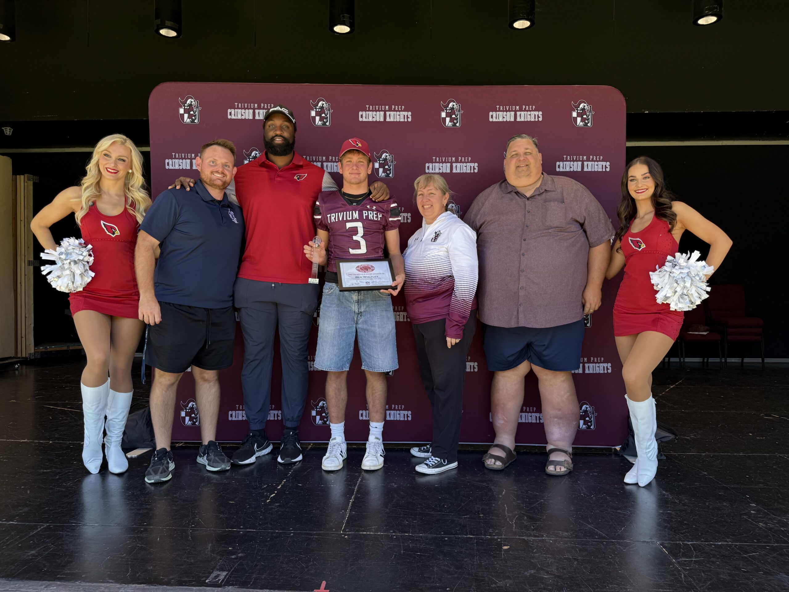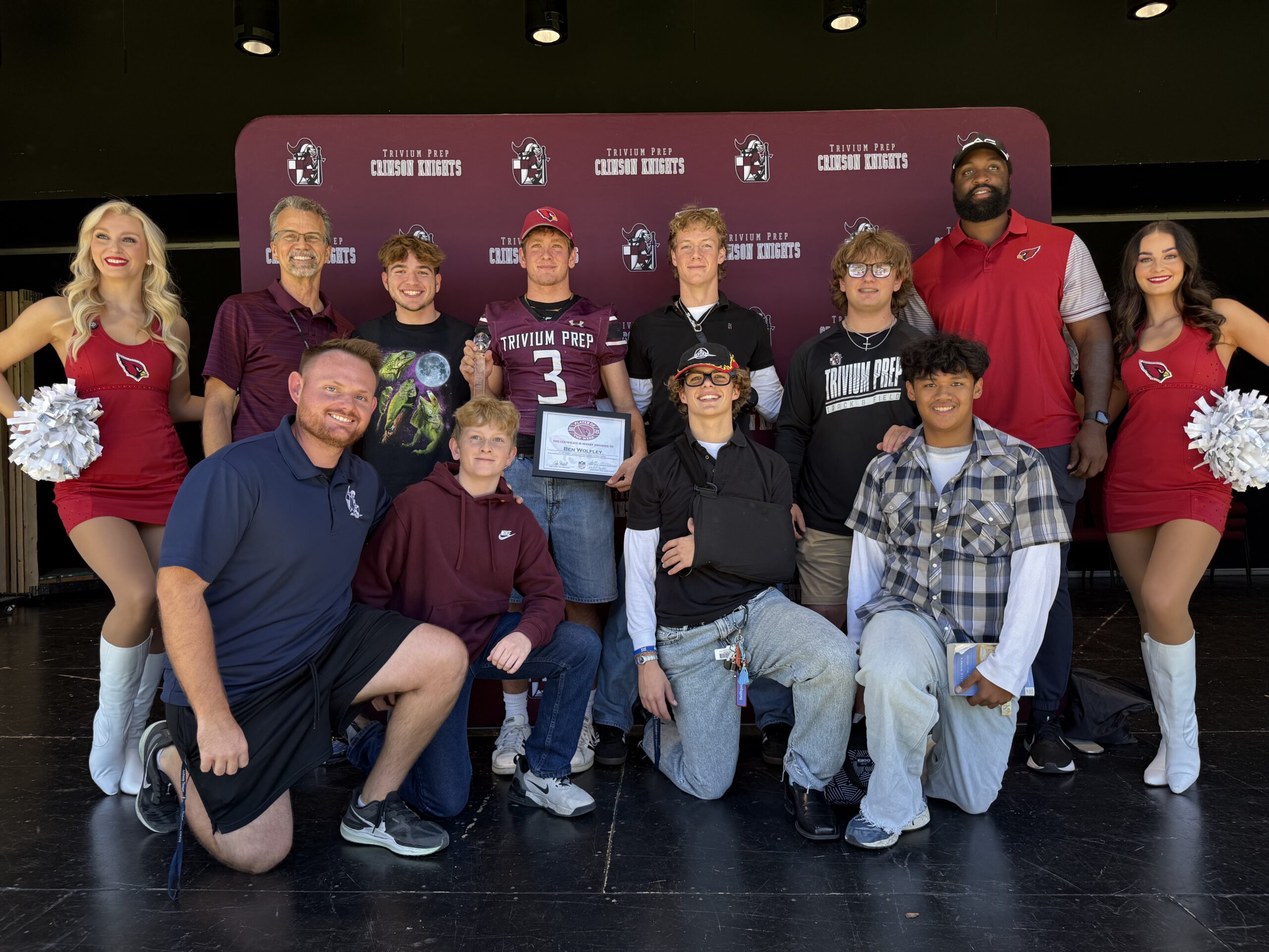 Trivium Prep Athlete Named Arizona Cardinals High School Player of the Week Facebook Twitter Email This Post Trivium Prep October 30, 2025 It was a day of celebration at Trivium Prep when representatives from the Arizona Cardinals paid a special visit to recognize one of the school’s standout athletes. In front of his cheering peers, junior Ben Wolfley was called out, much to his surprise, and named the Arizona Cardinals High School Player of the Week for his excellence both on and off the field. Cardinal Cheerleaders Jordan and Lauren from the Cardinals community outreach team, along with Cardinals legend, defensive end Zach Moore, arrived on campus to present the award. “I had no idea people were coming to the school and that I was getting a trophy,” Wolfley said afterward. The moment came as a complete surprise. Wolfley had learned only days earlier that he’d been nominated for the award after receiving a text from his former football coach with a link announcing his nomination. Wolfley’s talent and versatility have been key to his success on the field. On offense, he plays wherever he’s needed most, and on defense, he shines as a safety. His exceptional performance in the game against Mountainside earlier this month caught the attention of fans and ultimately earned him the Cardinals’ recognition. Photo courtesy of Carson Cavaletto He is grateful for the people who’ve helped him along the way. “My parents are always super uplifting and always supporting me in all my sports that I play. Just very grateful for them” he shared. “My brother—he’s down in Colombia serving a mission, and he helped me learn how to play offense.” He also took a moment to thank his coaching staff. “Shout out to all my coaches. Coach Mager, Coach Nick, Coach Jimerson, Coach Penn. They just always been there, always supporting me, they’re making sure I know what to do and letting me do what I can do and leading the team and giving me those chances. And shout out to Coach Wahlstrom. He’s been one of my biggest supporters as well.” As part of the honor, Wolfley received a certificate signed by NFL Commissioner Roger Goodell, Cardinals owner Michael Bidwill, and Head Coach Jonathan Gannon. He also received a custom trophy engraved with his name, game statistics, and Cardinals apparel. Representatives from the Cardinals praised Wolfley’s leadership, character, and commitment, saying he exemplifies what the High School Player of the Week program is all about: hard work, humility, and heart. Wolfley’s recognition from our local NFL team is a reminder that talent paired with character on and off the field can make for something truly special. Go Crimson Knights! Do you have a story or know of one that you would like to see featured at Great Hearts? Please contact jmoore@greatheartsamerica.org. Submit a student application to a Great Hearts Academy by visiting: https://www.greatheartsamerica.org/enroll/. Great Hearts, Great Stories Monthly Roundup Receive monthly news and updates by subscribing to our newsletter. Name(Required) First Last Email(Required) Enter Email Confirm Email PhoneThis field is for validation purposes and should be left unchanged.