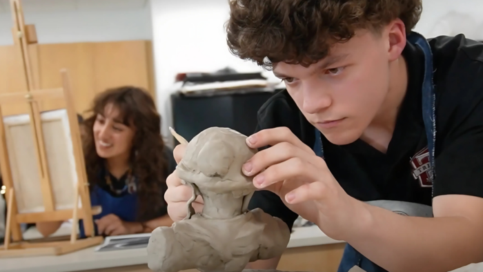 Trivium Prep’s Sculpture Artists Explore Three Dimensions Facebook Twitter Email This Post Trivium Prep January 16, 2025 At Trivium Preparatory Academy, students in the 12th-grade studio art class have embarked on a new medium that has taken their artwork into a whole new dimension. Debra Goley, the 12th grade studio art teacher, is helping her creative senior students transition from the two-dimensional art of drawing and painting to the hands-on work of clay sculpture. “This gives them a process where they can use their science and math skills,” explained Goley. “My background is architecture, so I love the model building process of having to think, not only of the front of something, but the top, the side, and how I’m going to formulate a piece so that it’s not going to wiggle and wobble, and actually be a worthy piece of art.” “Up until this point, they’ve worked primarily in two dimensions,” explained Goley. “But when they move into three-dimensional art, they’re challenged to think differently—to consider the front, top, side, and structure of their pieces. My background in architecture gives me a special appreciation for this process. I love watching my students embrace the complexities of creating something solid, balanced, and enduring.” The students’ sculptures are inspired by poetry written by their peers through a collaboration with the academy’s poetry class that combines literature with the fine arts. The process begins with selecting three or more nouns from a chosen poem, which then serve as the foundation for their sculptures. “We get to try and create or convey those ideas that they’re giving us,” shared Gavin Lopez, a senior art student. Lopez explained that he found inspiration in a poem about an orange. “When I was reading through the poems, there was one about an orange. And whenever I was trying to think of how I was going to depict it, I was thinking of a still life or some sort of painting.” “But after I started looking at some of the adjectives… the orange was described as elegant, and beautiful, and glistening. I thought, ‘Well, it kind of sounds like it’s describing a person. So that’s kind of what inspired this piece,” explained Lopez, pointing to a clay bust of a woman that he was creating. “The face was definitely one of the biggest challenges. Trying to have it look symmetrical, how I kind of had it envisioned in my head. But it really is just a lot of trusting the process and taking your time with the details and just trusting that it’s going to work out in the end.” For senior Katelyn Broadwick, sculpture provided an opportunity to explore new territory. “This is kind of challenging myself to see if I can explore 3D instead of 2D, which is my main medium.” Broadwick chose to challenge herself with a sculpture of a shark. “With 2D, you’re only focusing on one side… but here you have to do everything,” she said as she explained how she used wire within the clay to keep the form from “flopping” over. Persephone Preciado took a surrealist approach, drawing from a poem about an eclipse. “It described the vibrancy when [the sun and moon] had first collided,” she explained, speaking of the joy that the poem evoked, which inspired her color choice for her mixed-medium piece, using clay for dimension on a canvas. “I used magenta, cyan, and yellow because those colors always end up so much more vibrant… and I used the clay in a way to kind of pop out the moon and the sun rays.” Goley finds Beauty in the entire process of these projects, from start to finish. “They bring back their inspiration photos to me, they combine all these images, and they make something beautiful themselves,” she shared. “There’s something about them actually observing that makes them slow down and think about the surroundings they’re in. So, I think that’s really important that we take time to observe what’s already been made beautiful.” Goley’s sculpture class offers a refreshing return to manual creativity. It challenges students to think critically, experiment with materials, and transform abstract ideas into physical forms. At Trivium Prep, the art of sculpting explores the potential of human hands and minds. Do you have a story or know of a story that you would like to see featured at Great Hearts? Please contact jmoore@greatheartsamerica.org. Submit a student application to a Great Hearts Academy by visiting: https://www.greatheartsamerica.org/enroll/.